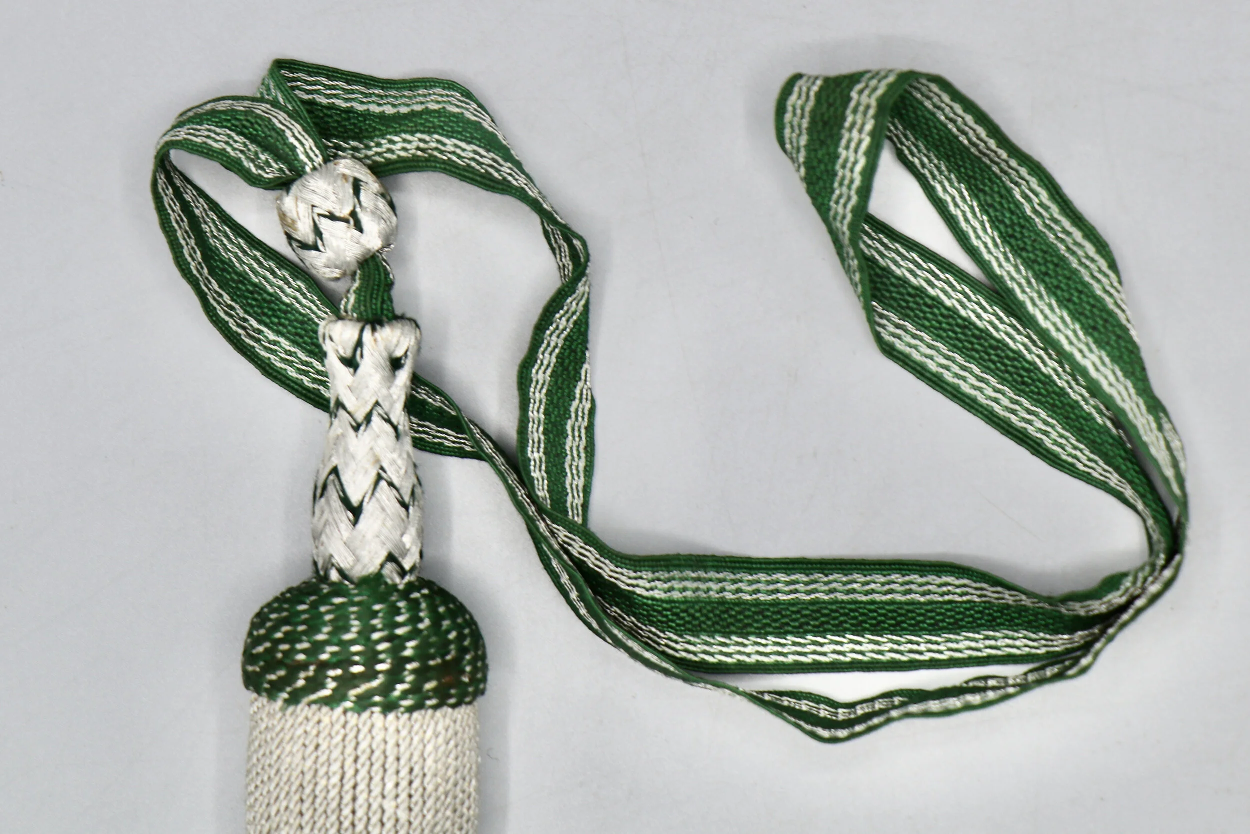Up for sale is an NCO’s bayonet knot or Troddel. This knot consists of a strap, slide, stem, crown, and ball. The slide and stem are both in interwoven bright silver/aluminum wire threads with a repeating, interwoven dark green “V’ pattern. A great addition to your dagger!