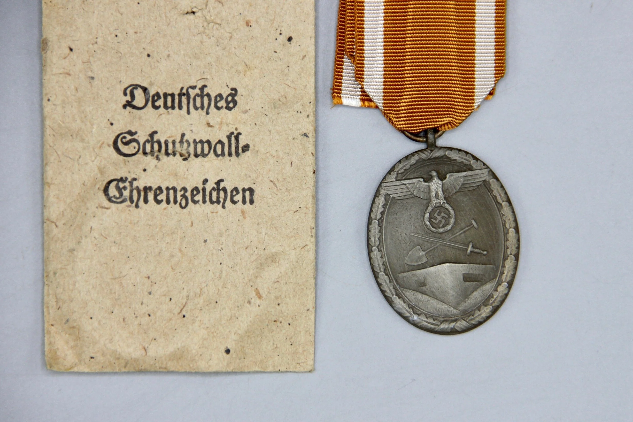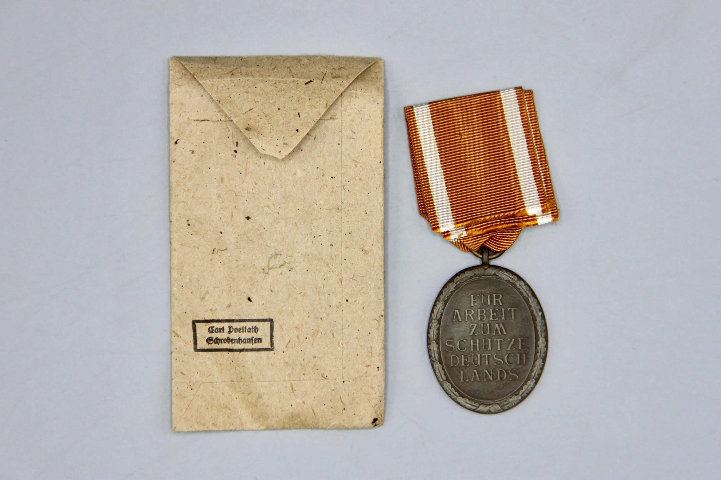 The back of the medal reads “Fur Arbeit Zum Schutze Deutsch Lands”. The original medal packet of issue reads “Deutsches Schutzwall-Ehrenzeichen”.