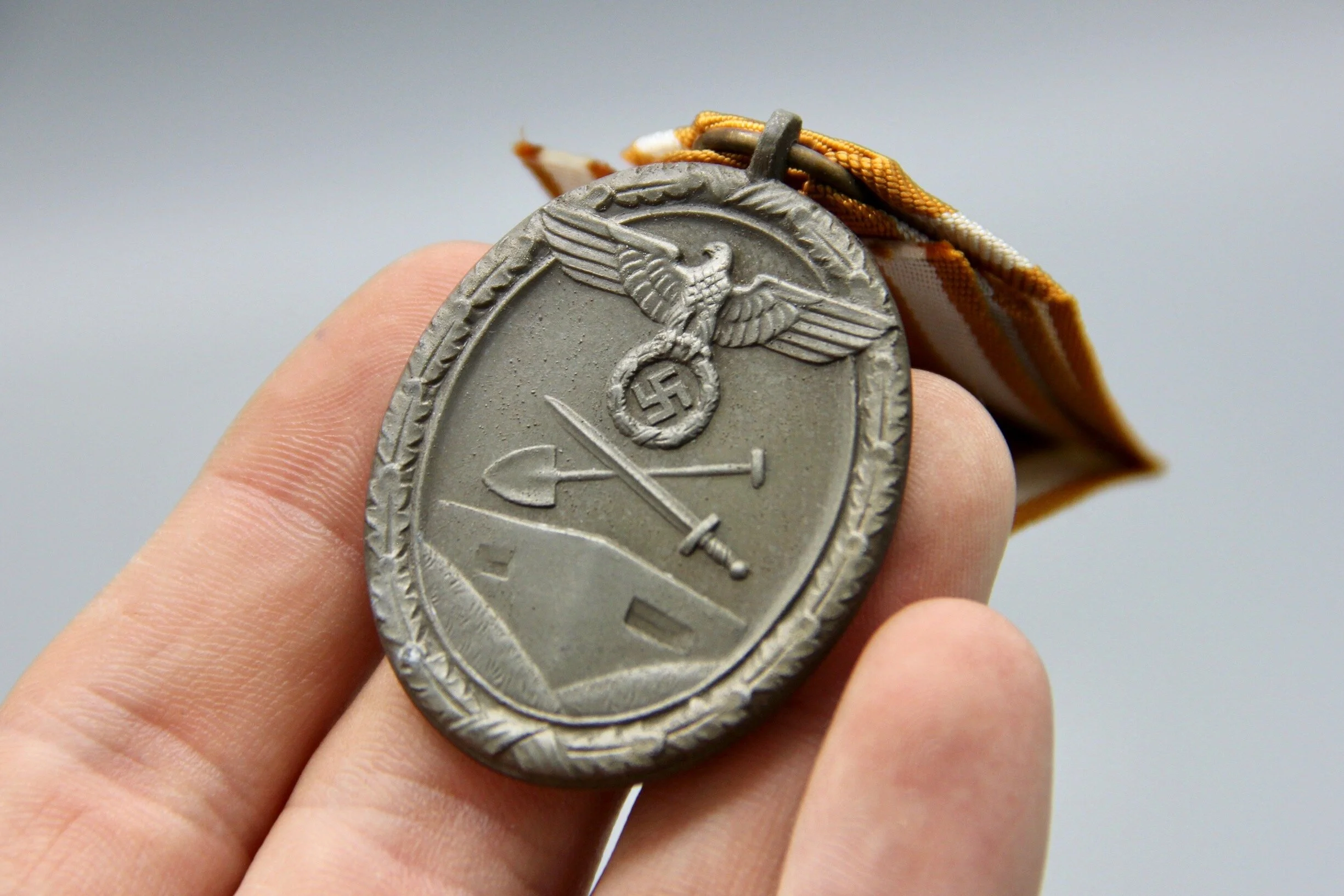 Up for sale is an Original German WWII West Wall medal with its original presentation award packaging and ribbon. First established in August of 1939, these medals were awarded to members of the Wehrmacht who helped build the fortifications on Germany’s western borders. This included pillboxes, bunkers, gun emplacements and more.
