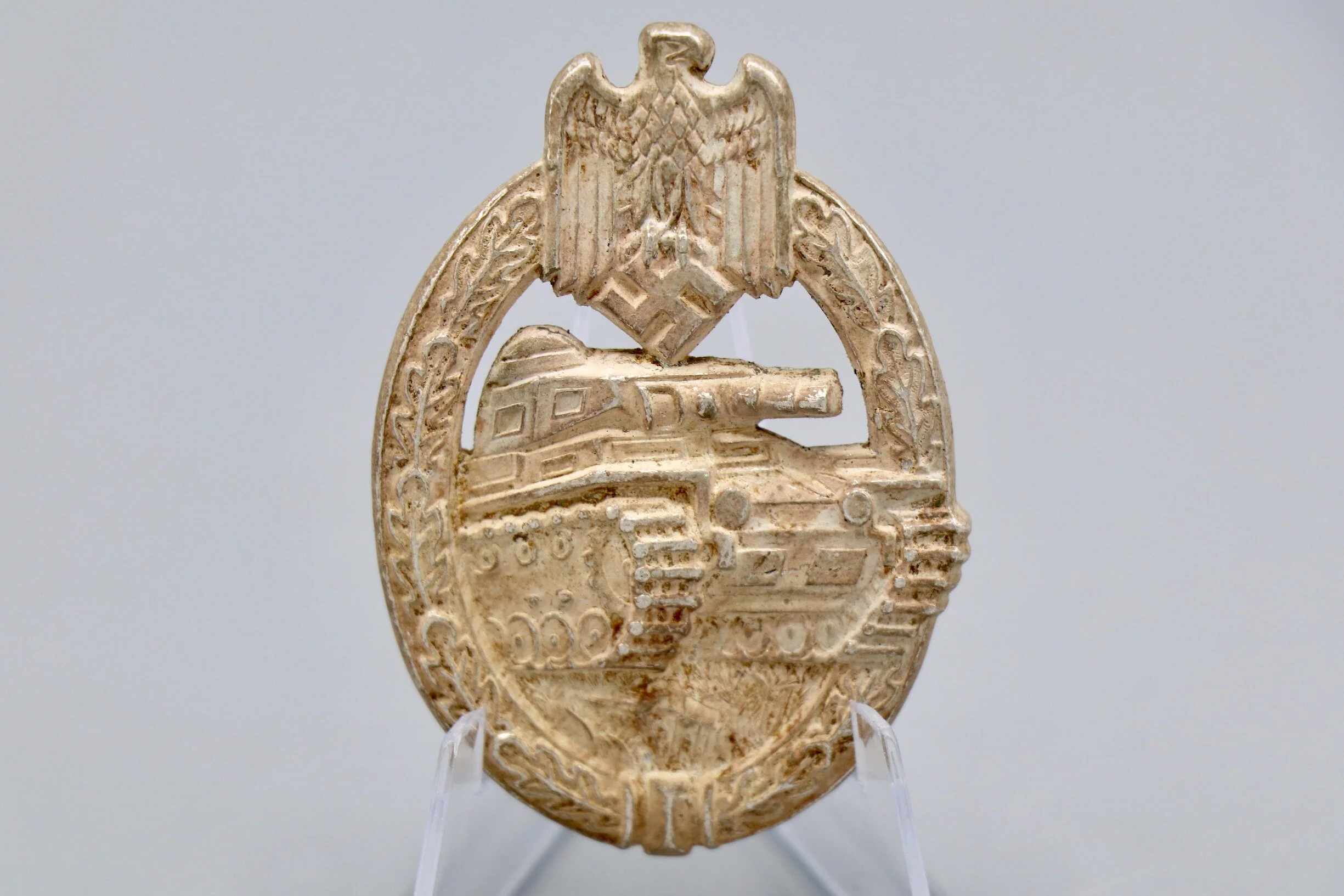 Up for sale is a very high quality reproduction German WWII Silver Panzer Assault Badge (PAB or Panzerkampfabzeichen) made post war by AH. This badge would have been issued to members of an armored division for recognition of armored assaults. In 1940, a Bronze version of the badge was created for of other members who were involved with an armored assault but were not in tanks (half tracks, etc.). The criteria for being awarded Silver was :