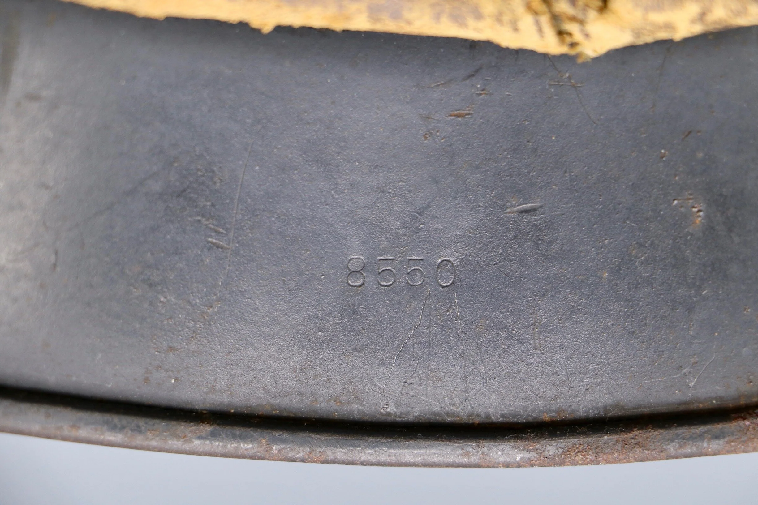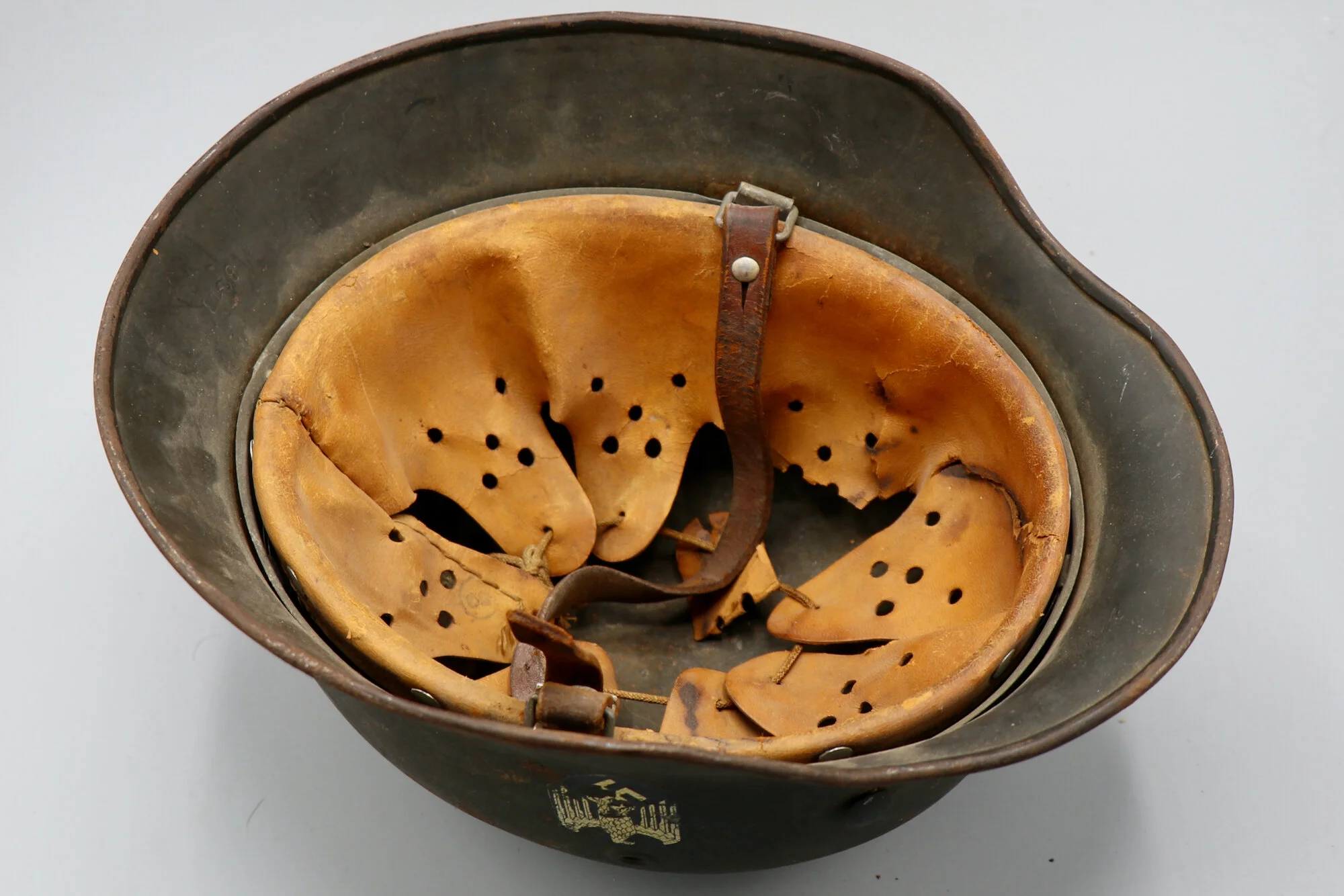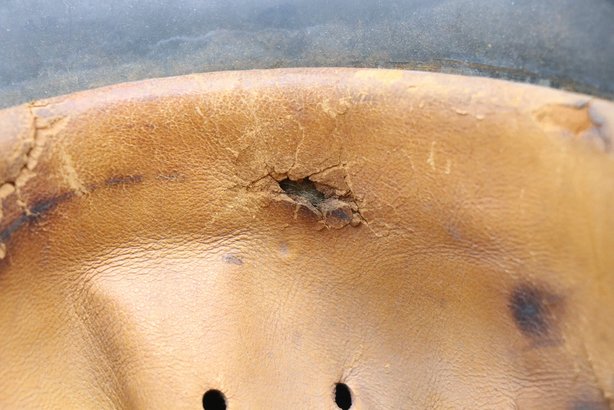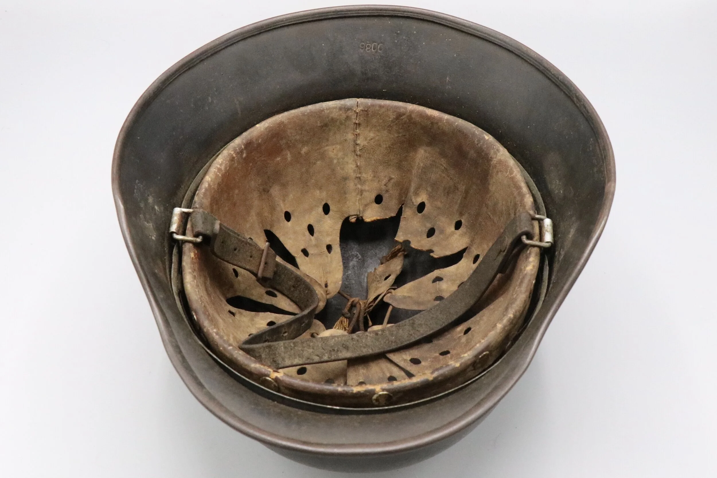 The inside of the helmet is in great condition excluding the leather liner. The leather liner seems to have been used heavily and covered in blood at one point. This blood staining has hardened the leather that remains and likely rotted the other areas away. Overall a very interesting piece at an affordable price.