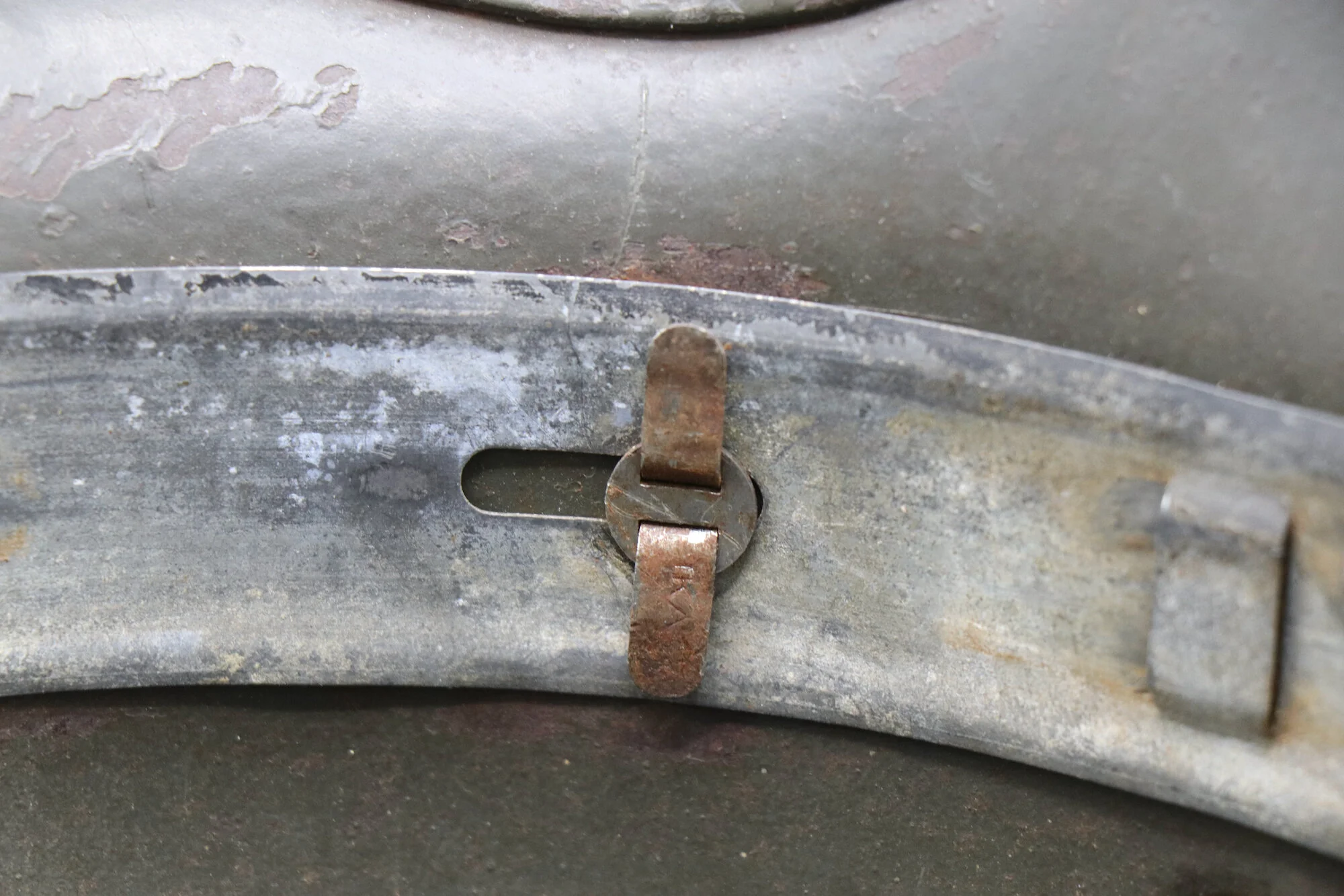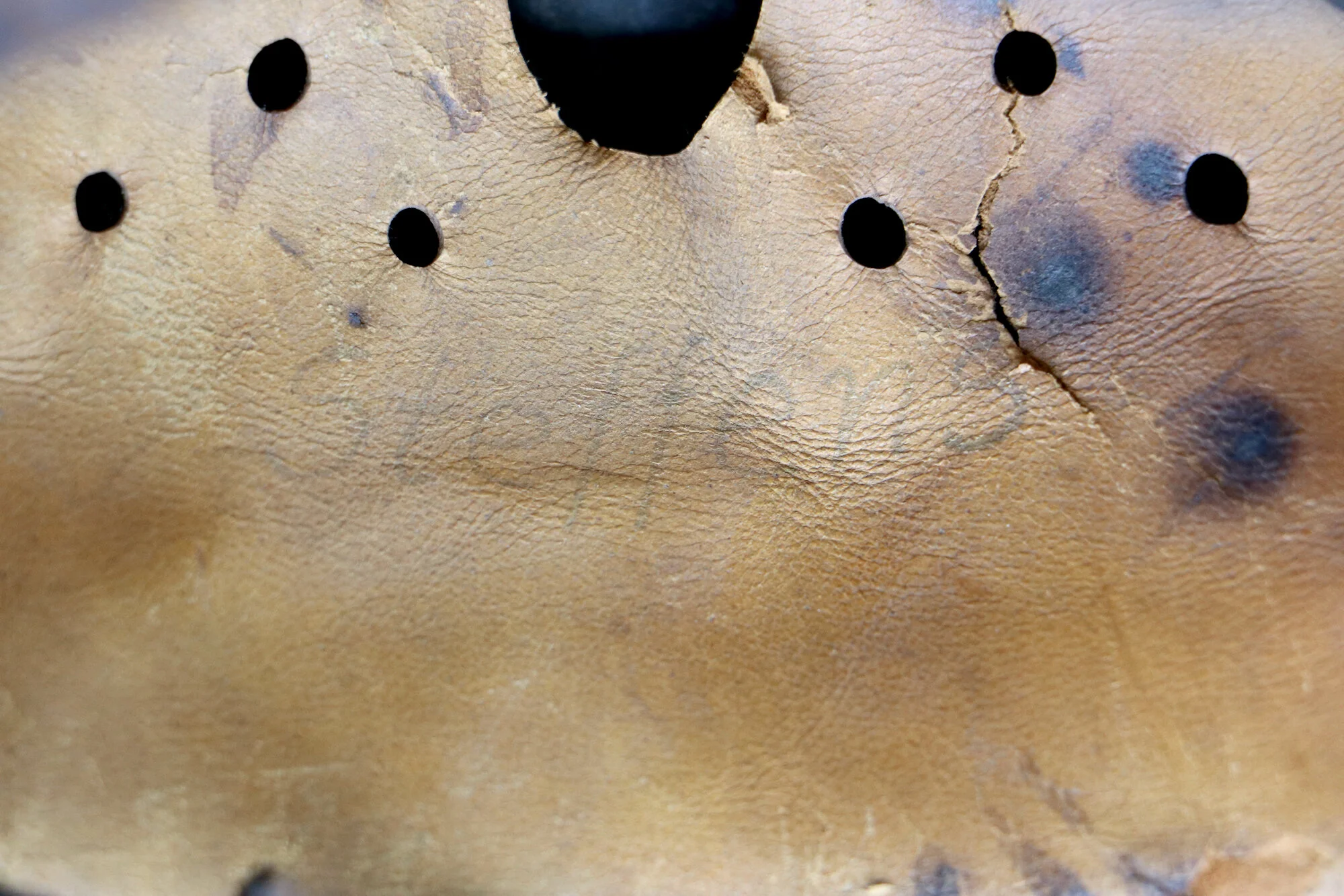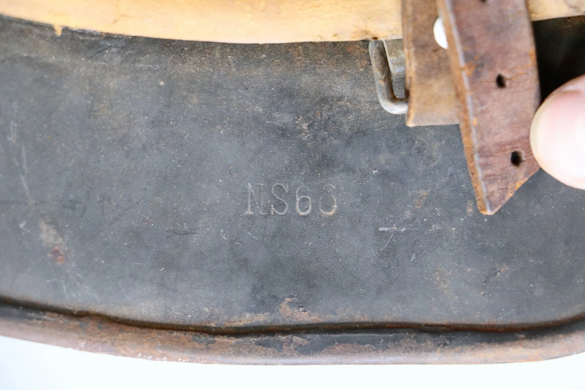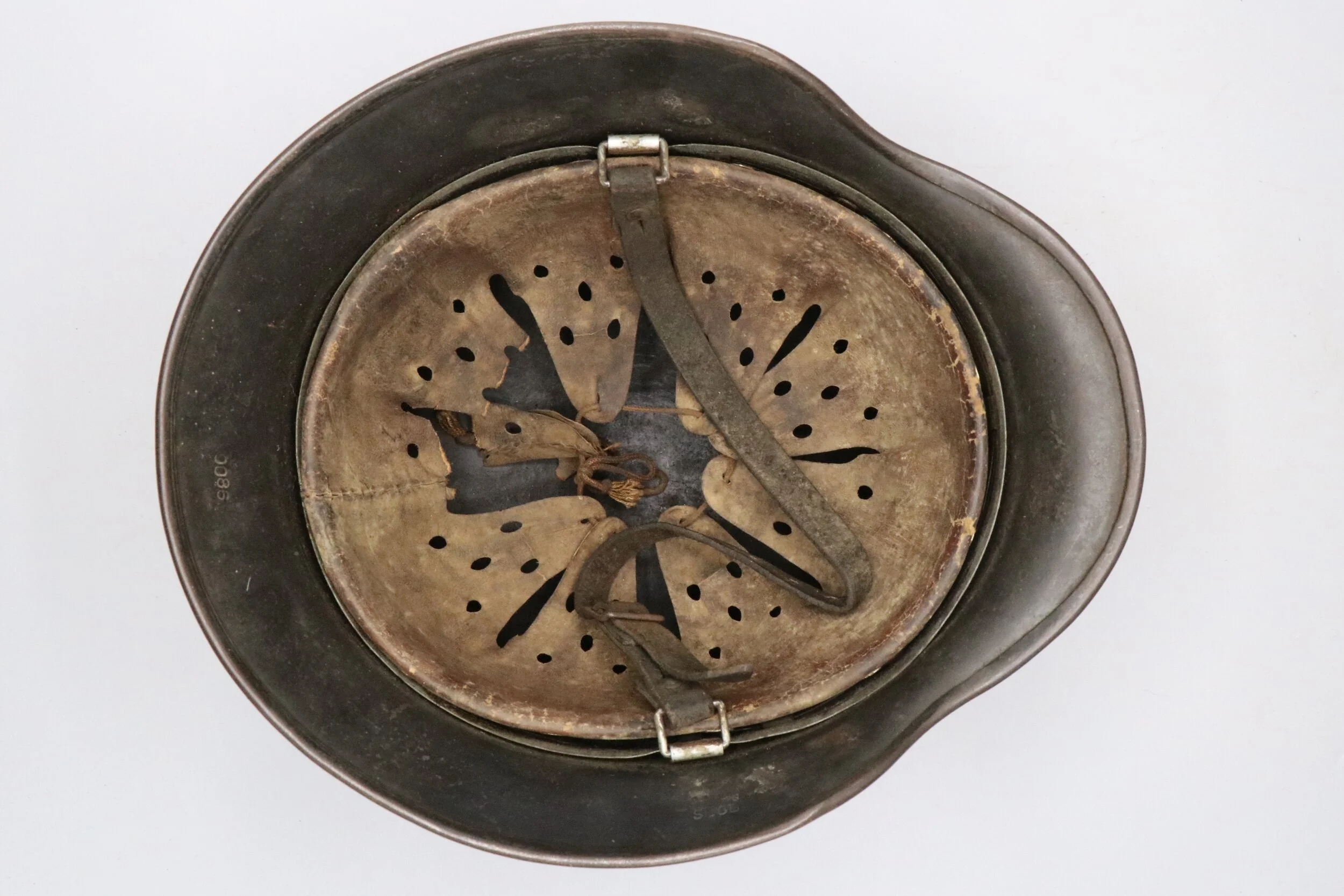 The inside of the helmet is in great condition excluding the leather liner. The leather liner seems to have been used heavily and covered in blood at one point. This blood staining has hardened the leather that remains and likely rotted the other areas away. Overall a very interesting piece at an affordable price.