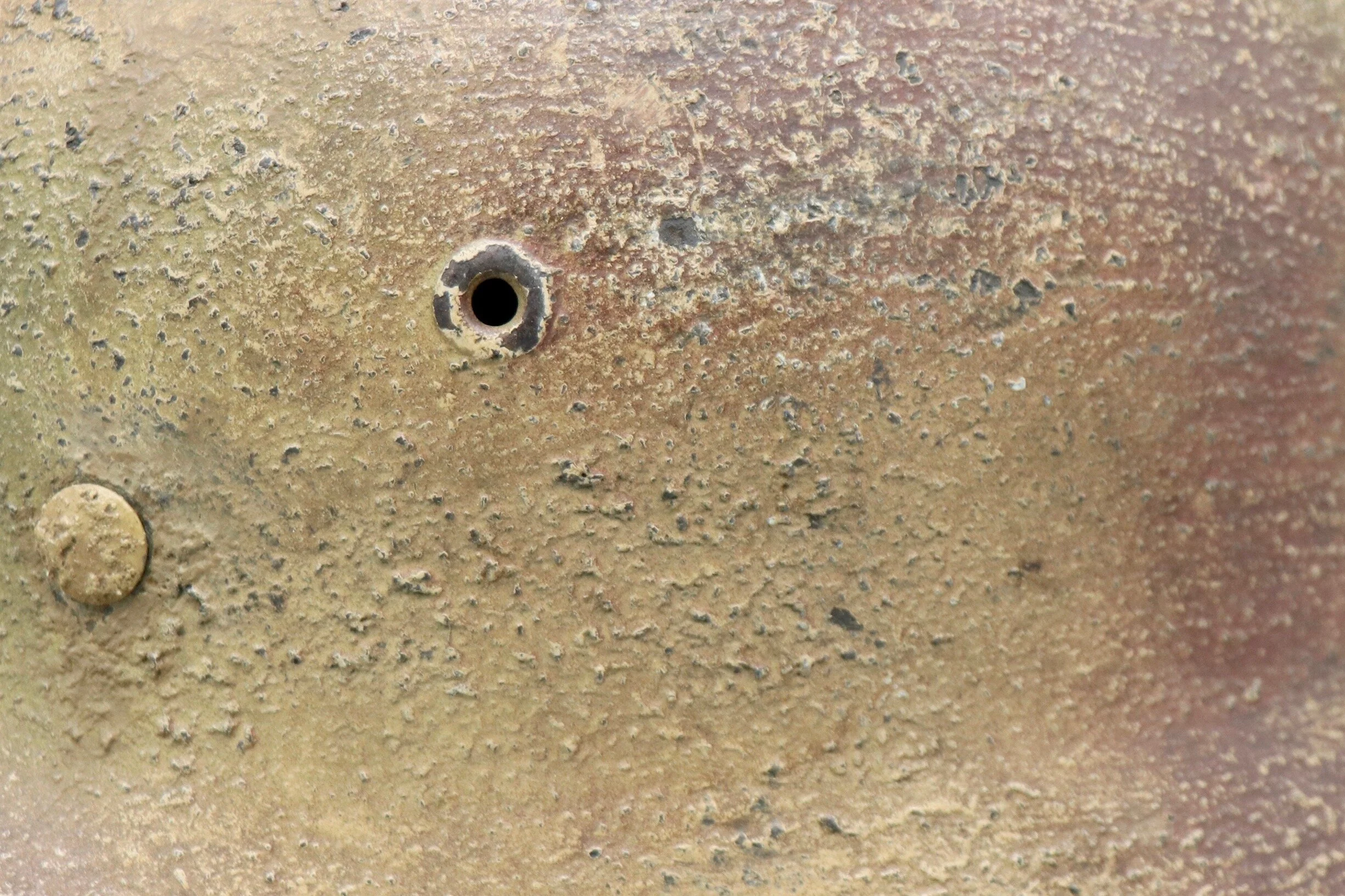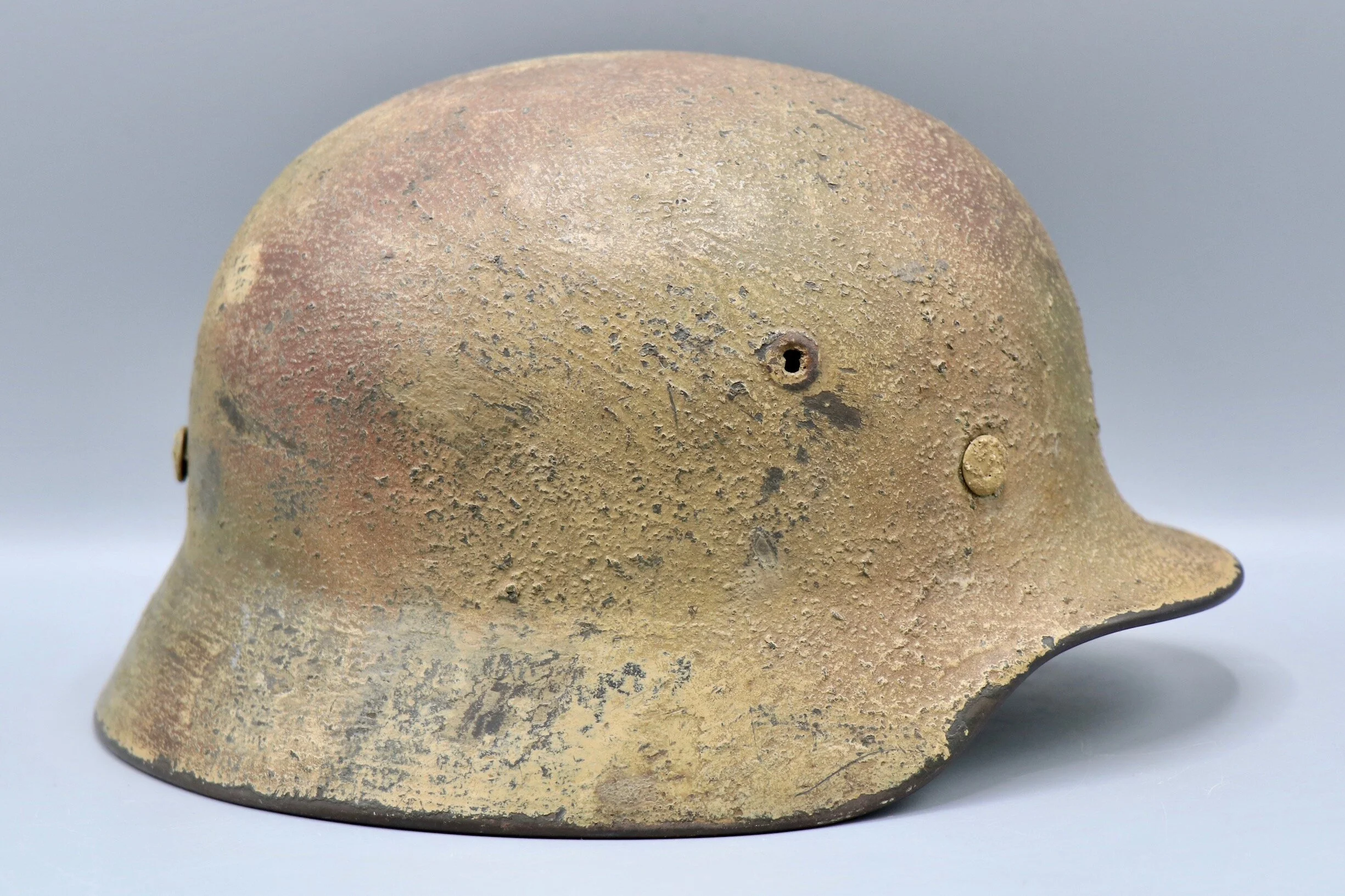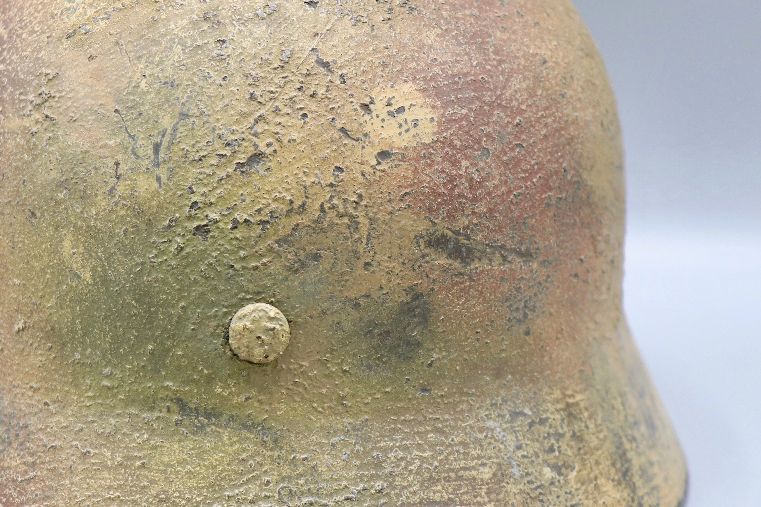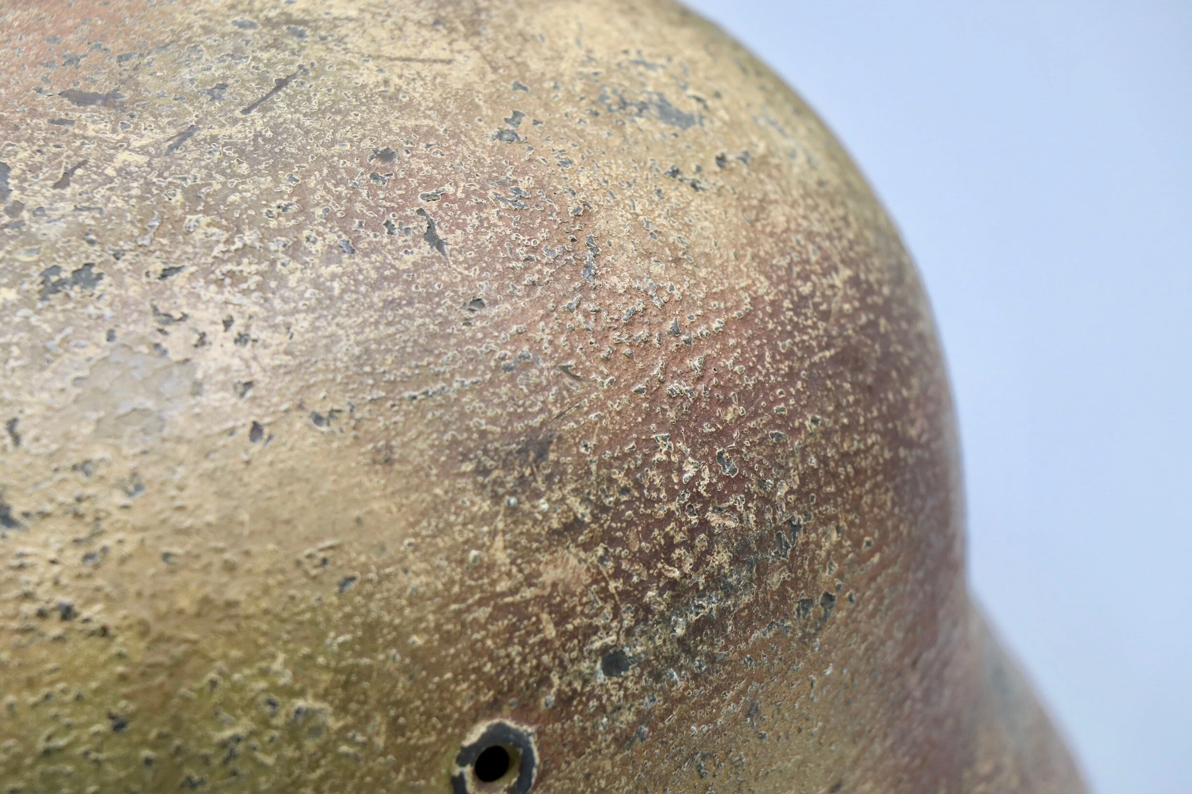 Up for sale a very nice and original German WWII 3 tone Normandy camouflaged M40 helmet, sometimes referred to as a southern front camo. This helmet is absolutely stunning with rich colors, a rare paint variation, a combat history, a named skirt, and a complete liner! The helmet is fully covered with a rich yellow / tan, green and brick red. If this wasnt enough, the camo overpaint also has a mixture woodchips for added texture to the shell.