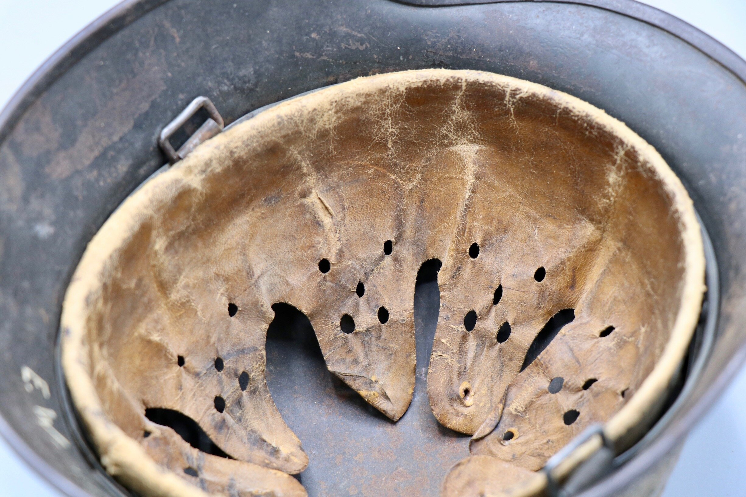 Looking at the inside of the helmet, the leather liner is near complete condition with its draw string missing. The outer brim of the helmet interestingly shows the original Luftwaffe blue factory finish. Moving towards the rear skirt, we can see that the shell is nicely named to :