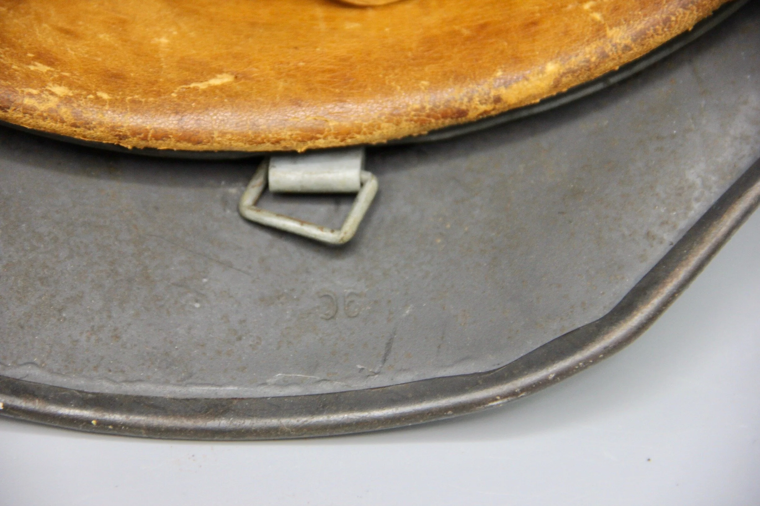 The shell and liner are both in immaculate shape. Besides the de-nazification, the eagle also is in almost perfect condition. The leather liner is also very soft, but only missing its draw string. This helmet has come directly from the veterans son.