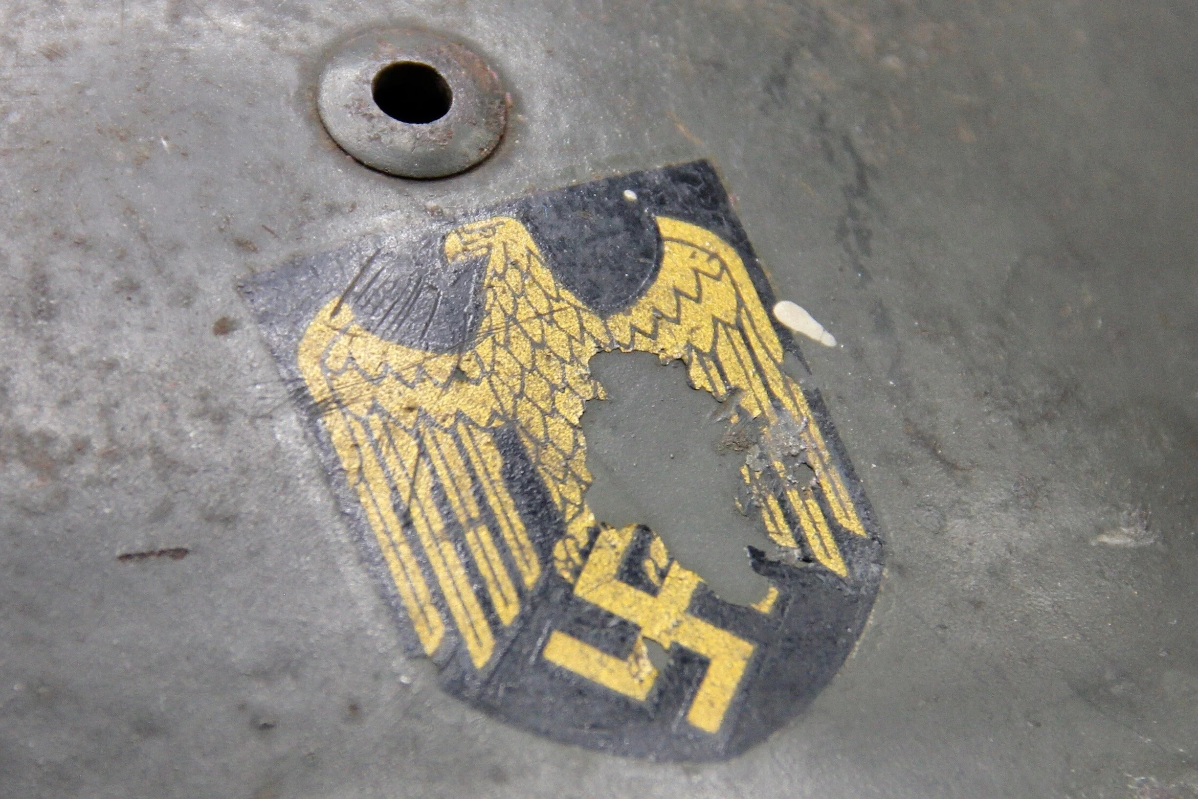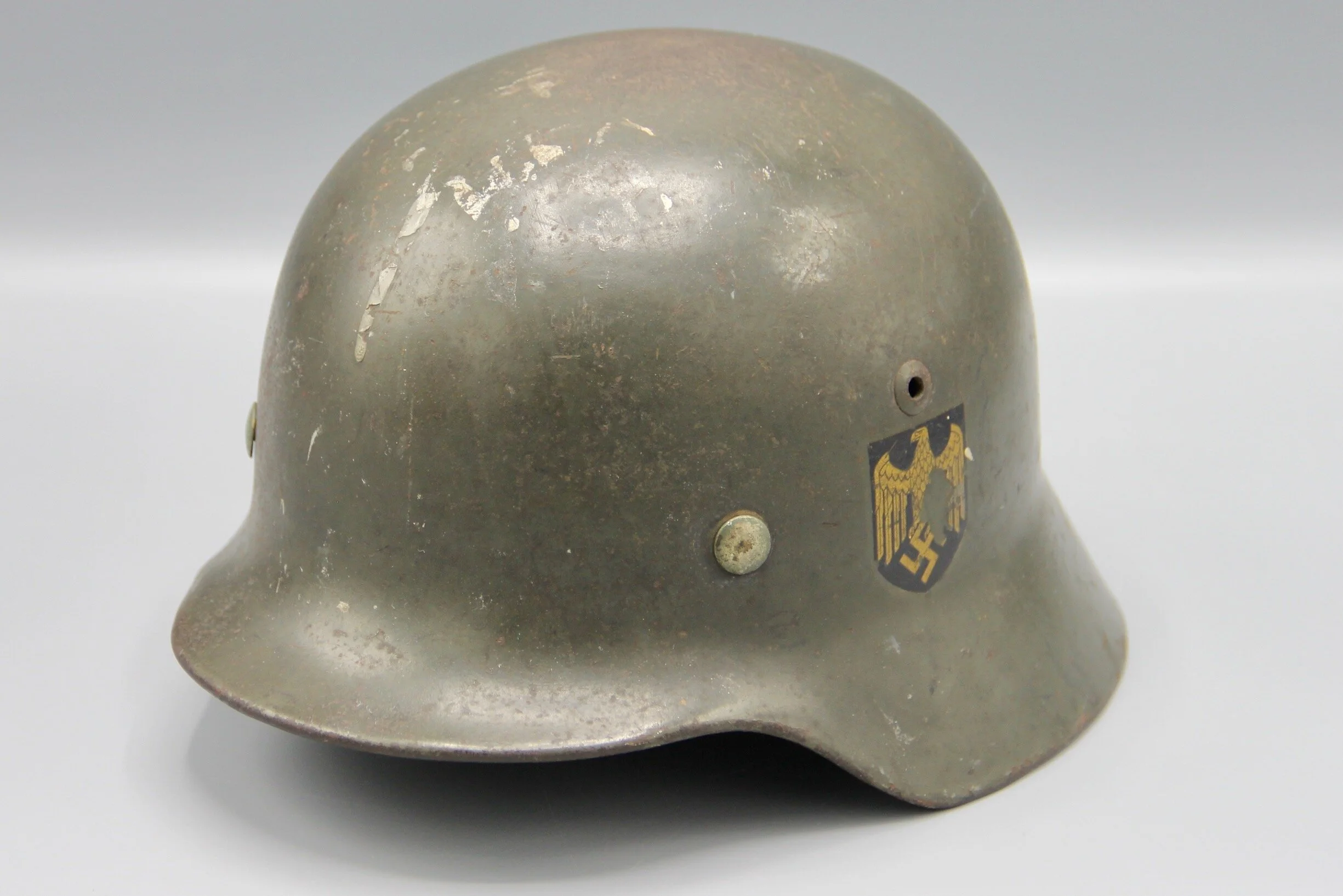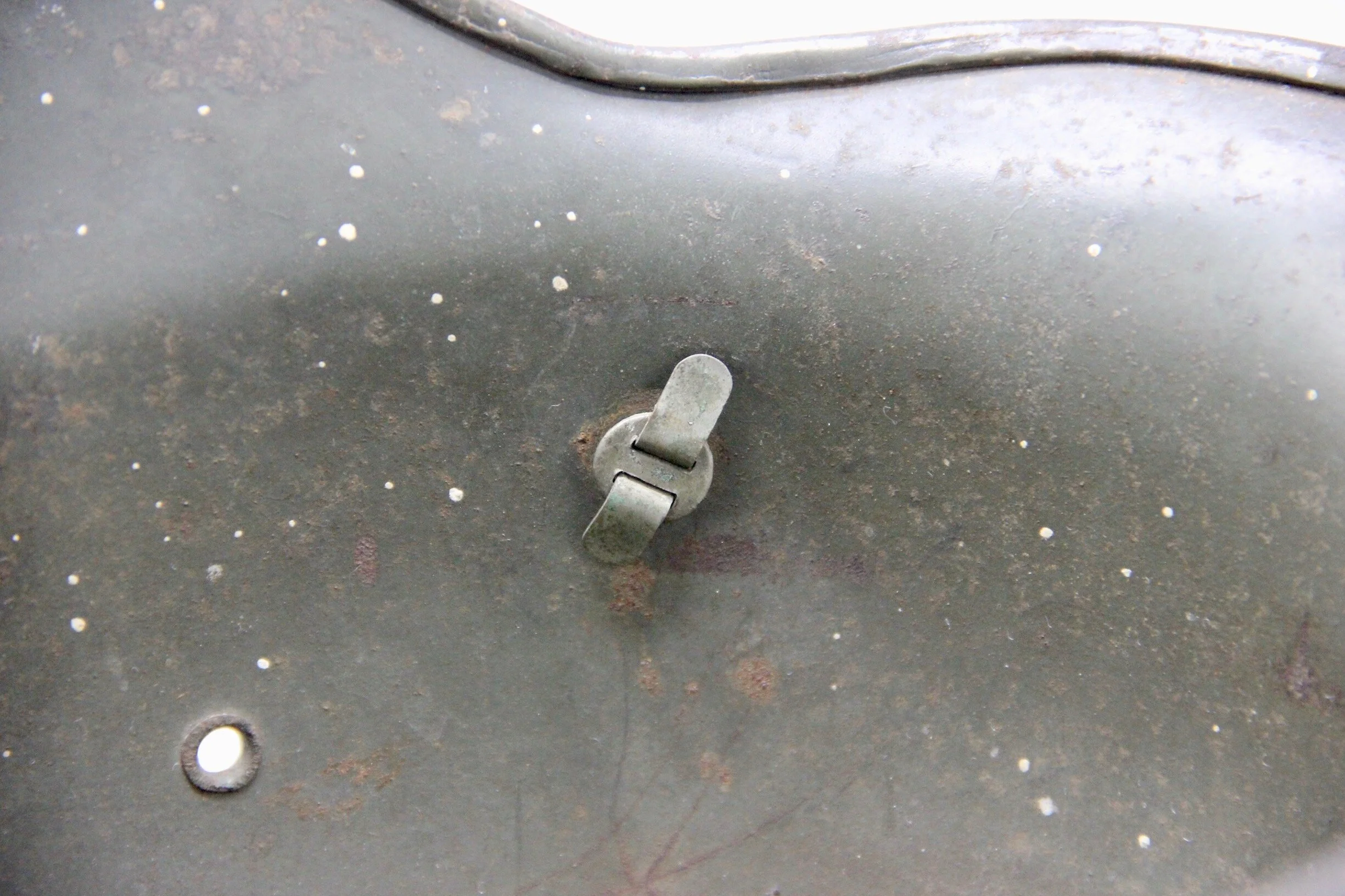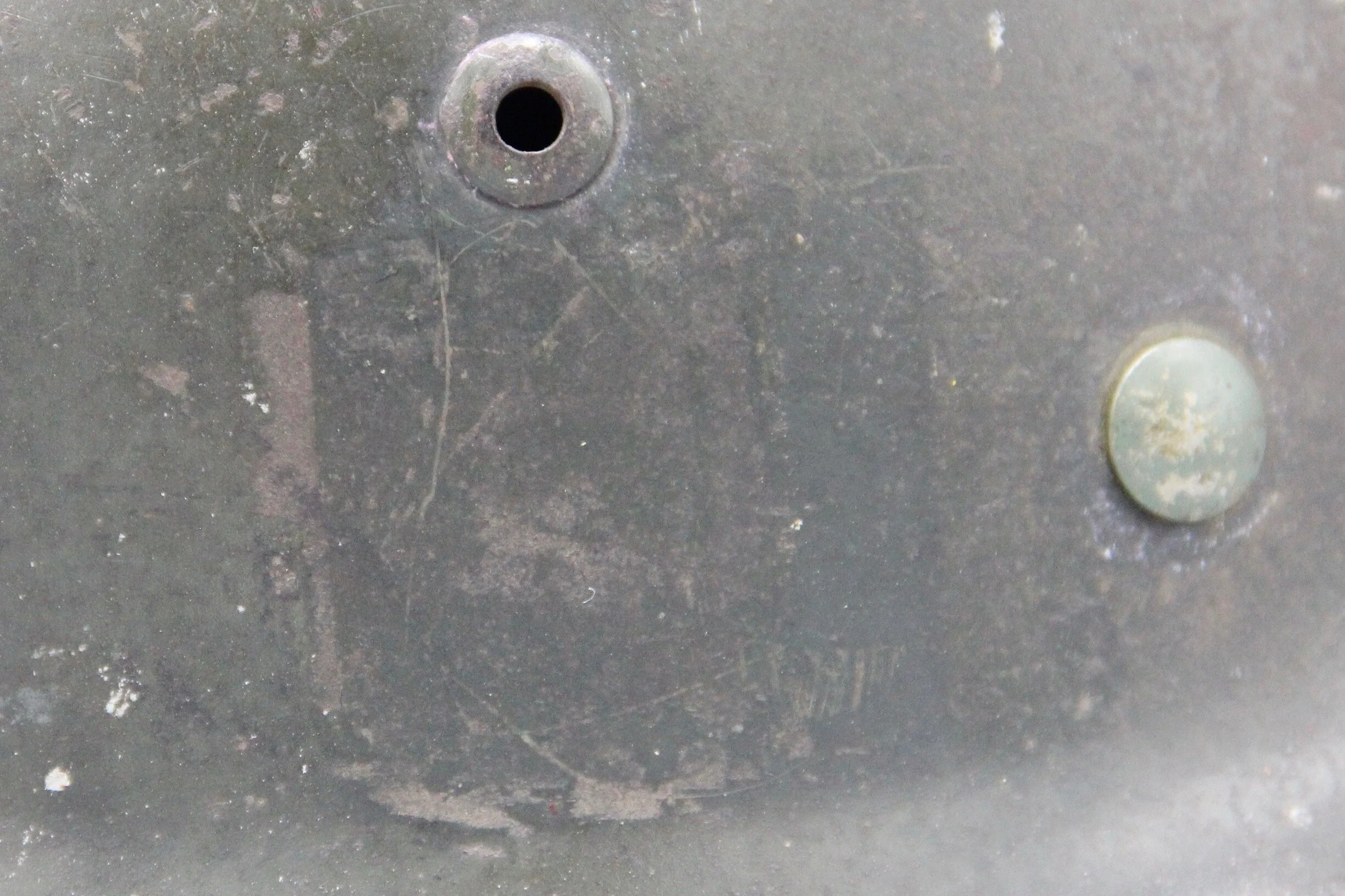 Up for sale is a very nice and original German WWII M35 DD KM, or Kriegsmarine Helmet. This helmet has had a very interestingly life, starting with how we found it. This piece came straight from a dumpster. Yes you read correct, a dumpster. In Kentucky one of our pickers was searching the remains of a house clearance and saved this gem from being lost forever. Looking at the helmet, the shell is in really great shape with a very fine factory finish. The Kriegsmarine decal is a textbook example with layering on the eagle, a thick black border surrounding the eagle, flaking of the eagle, and of course a very rich gold color. At one time this was actually issued with a German National Shield, or Tri-color decal. As per regulation, it was removed sometime around 1940.