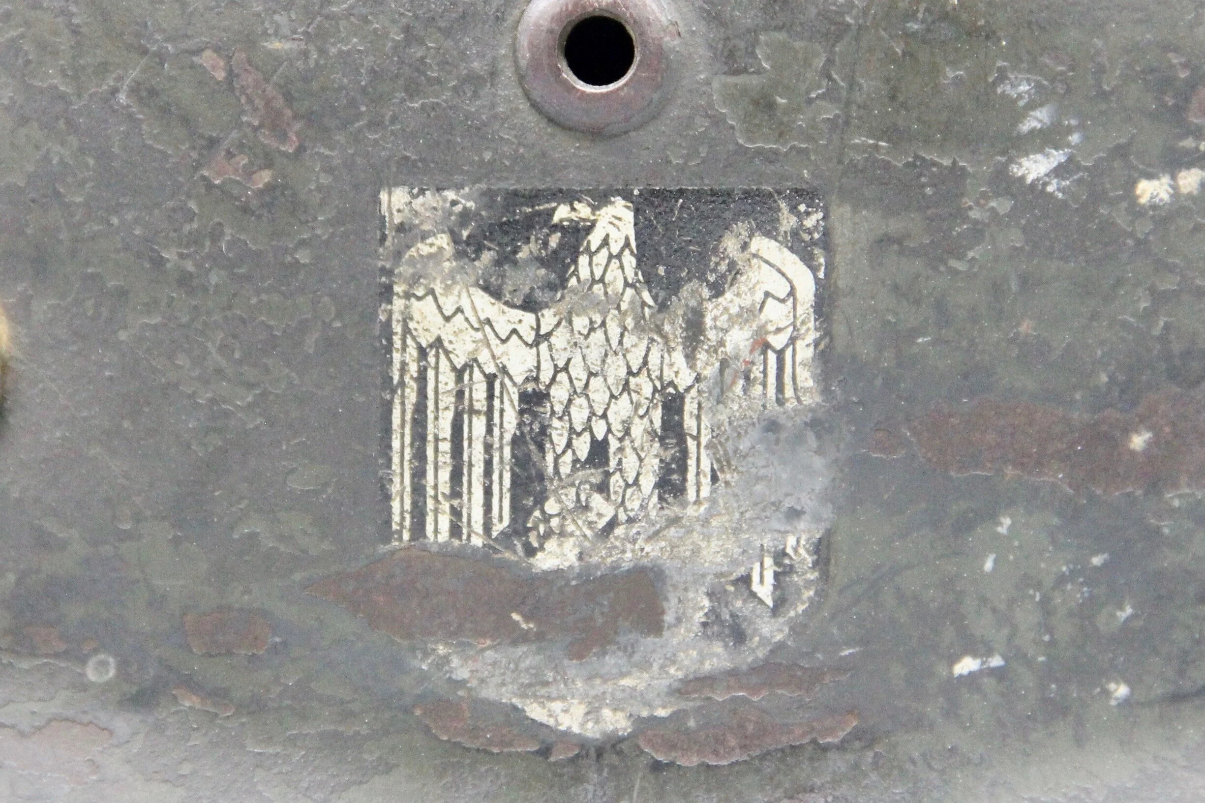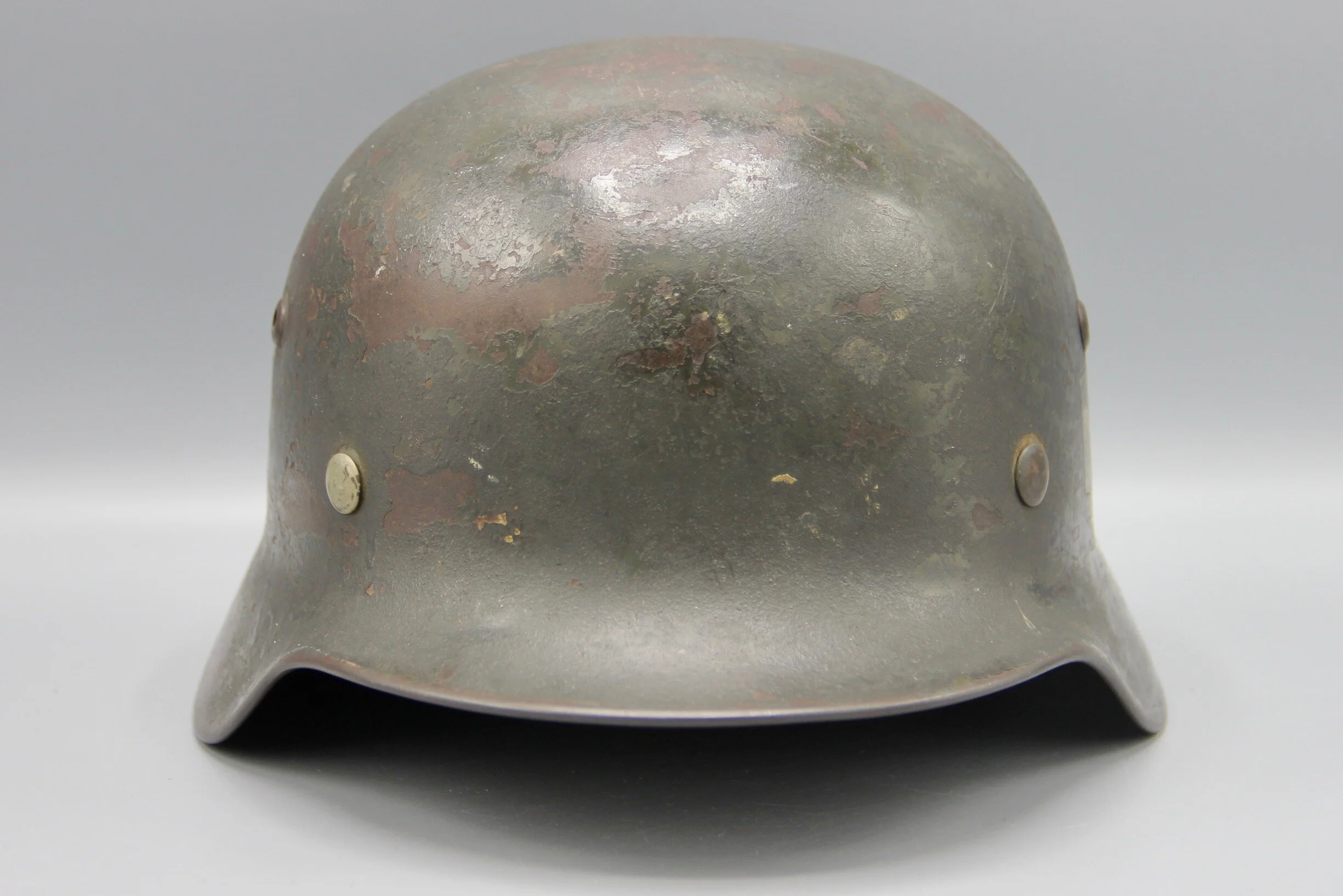 Up for sale is a very nice and original German WWII Double Decal Heer Helmet with a rich combat history. This M35 originally began its life as a German WWII Double Decal Heer Helmet, and then re-issued later in the war to the Heer once more. We can note both the original apple green finish, mixed with the re-issued darker green coat. This ultimately gives the piece a lot of character with a strong combat appeal. The German Heer eagle shows heavy sings of wear and use, as after its re-issued, the decal was not replaced. The German tri-color national shield is very well outlined, however still completely covered by the re-issued dark green paint.