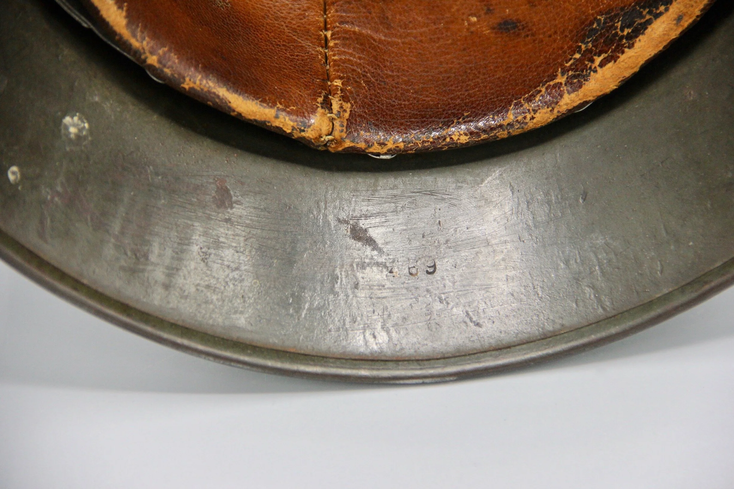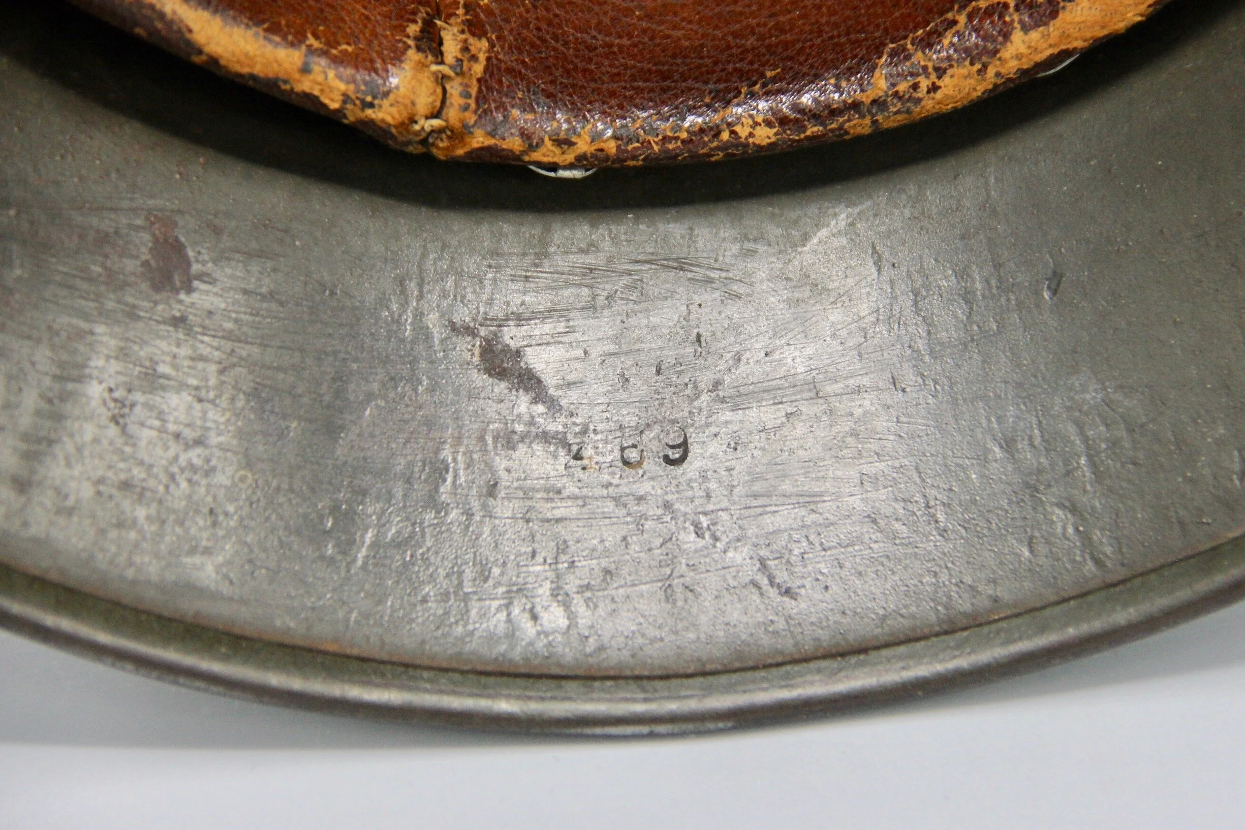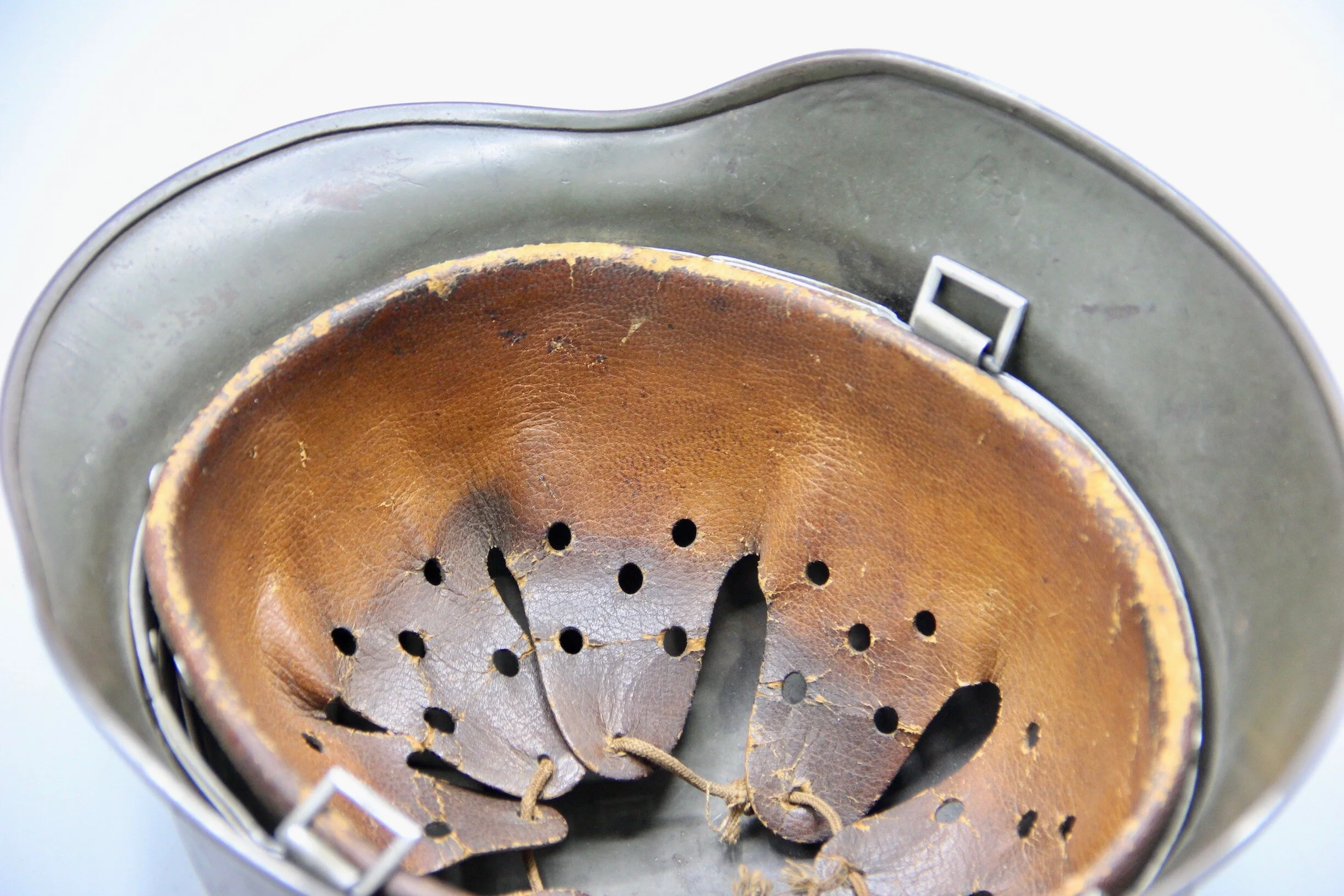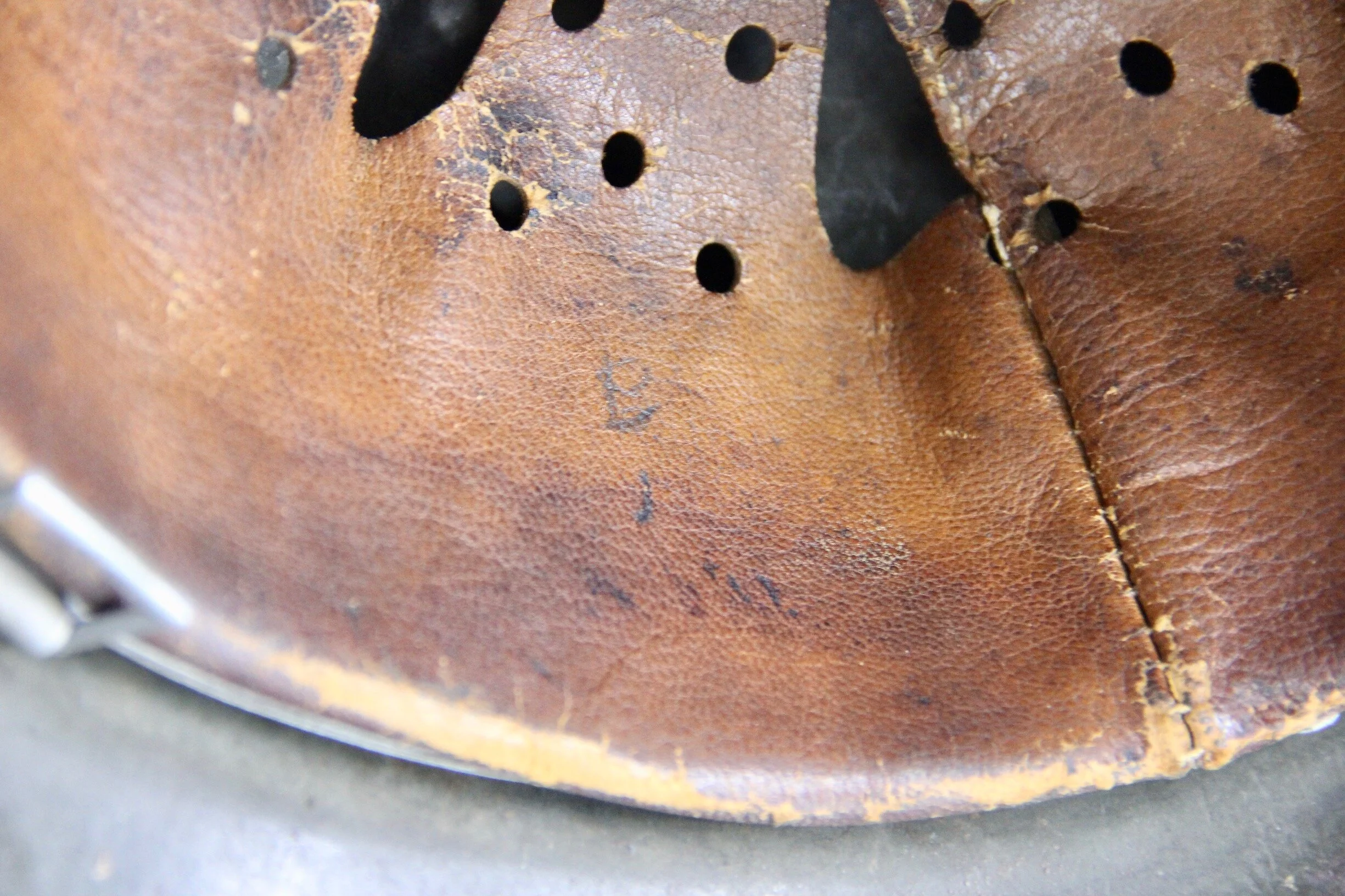 The inside shell is a matching condition to the exterior with a complete late war pigskin liner and a once named skirt ! The leather liner is still in very good condition with some signs of use and sweat stains from WWII. The brim of the helmet was engraved at one point – but scratched out. This is a common occurrence when soldiers surrendered, and did not want links back to their equipment.