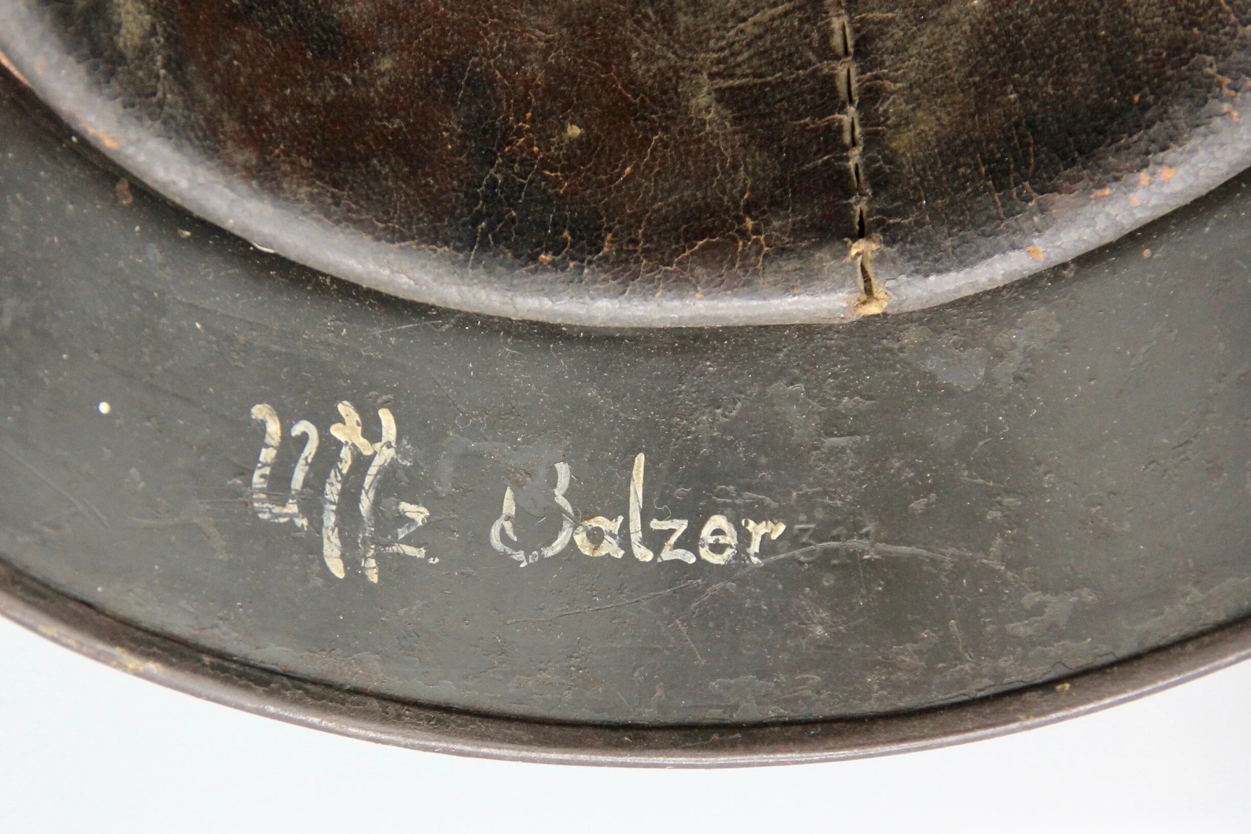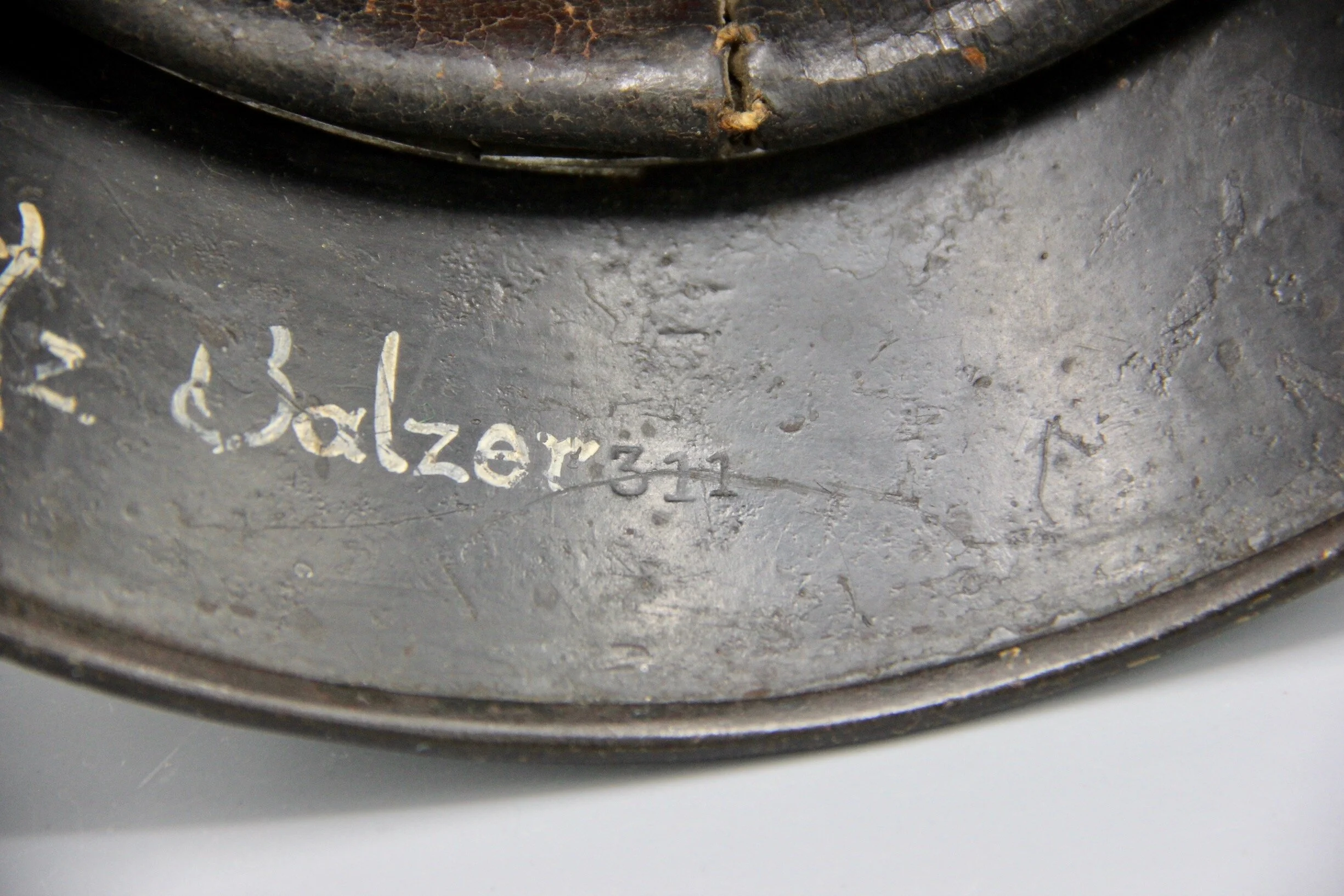 Looking at the inside of the helmet, the leather liner is complete and still in great condition. The leather has darkened likely from use during the war – and especially around the brim of the leather we can note sweat stains from its original owner. Moving towards the rear skirt, we can see that the shell is nicely named to :