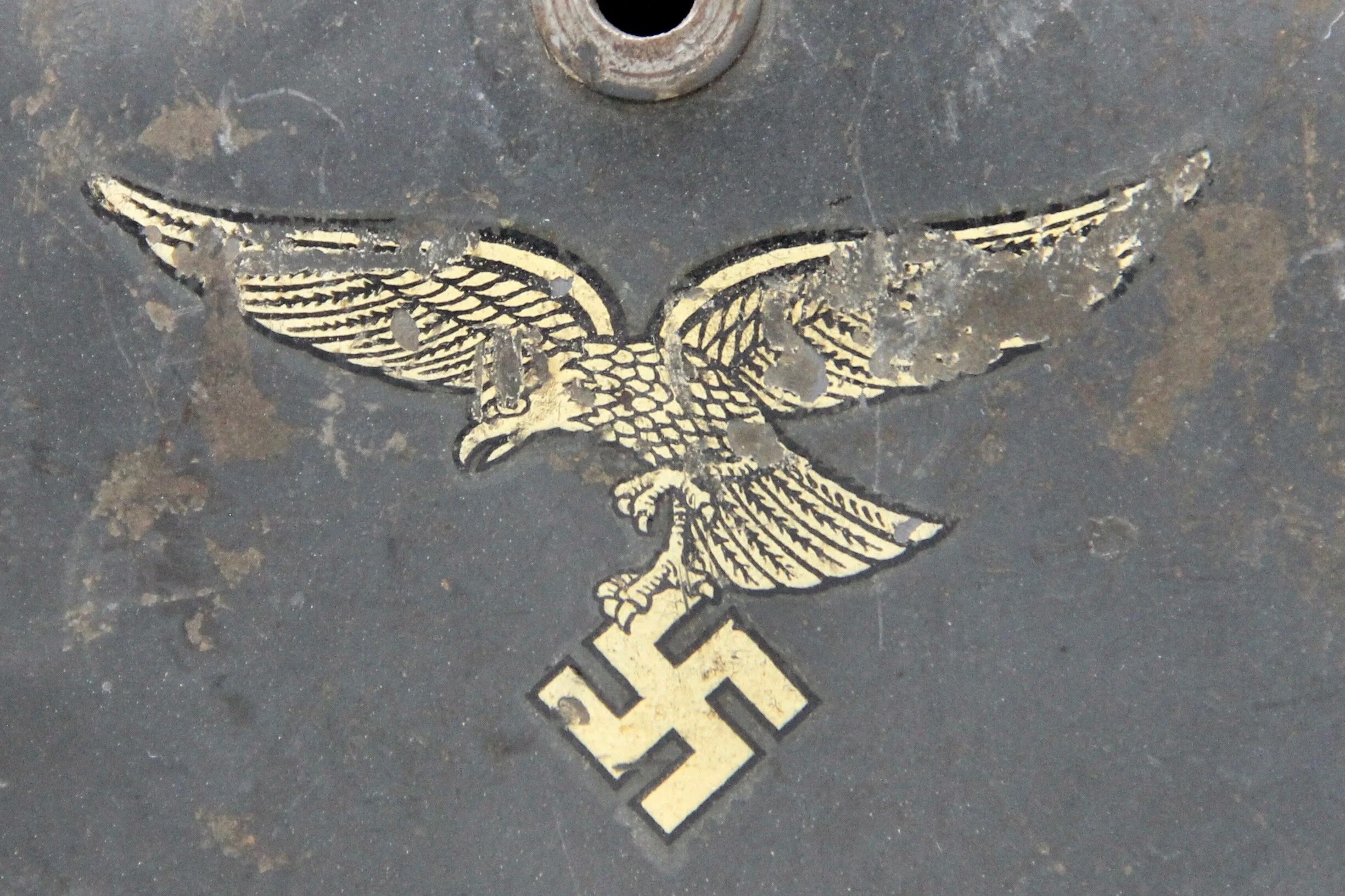 Up for sale a very nice and original, German WWII Early Luftwaffe DD Helmet. This piece is really one of a kind and a helmet you will have tough time upgrading from. In near perfect condition, this M35 has a beautiful patina with a strong blue factory finish. Areas of the shell do show signs of period use which really give great character to the helmet. This Luftwaffe helmet is pre-war issued, and still current with its first pattern droop tail eagle. It also is complete with its German National Shield, or Tri-color decal. Looking at the top of the helmet, some rings can be noted. This is usually a sign that the helmet was stacked at one point. This was likely due to the helmet being surrendered after the war, and this being picked out as a souvenir.