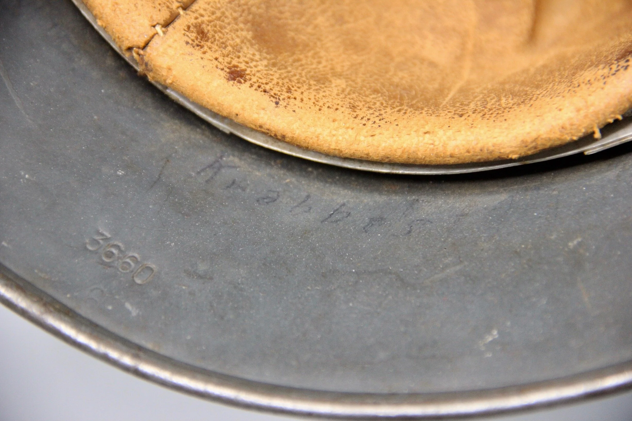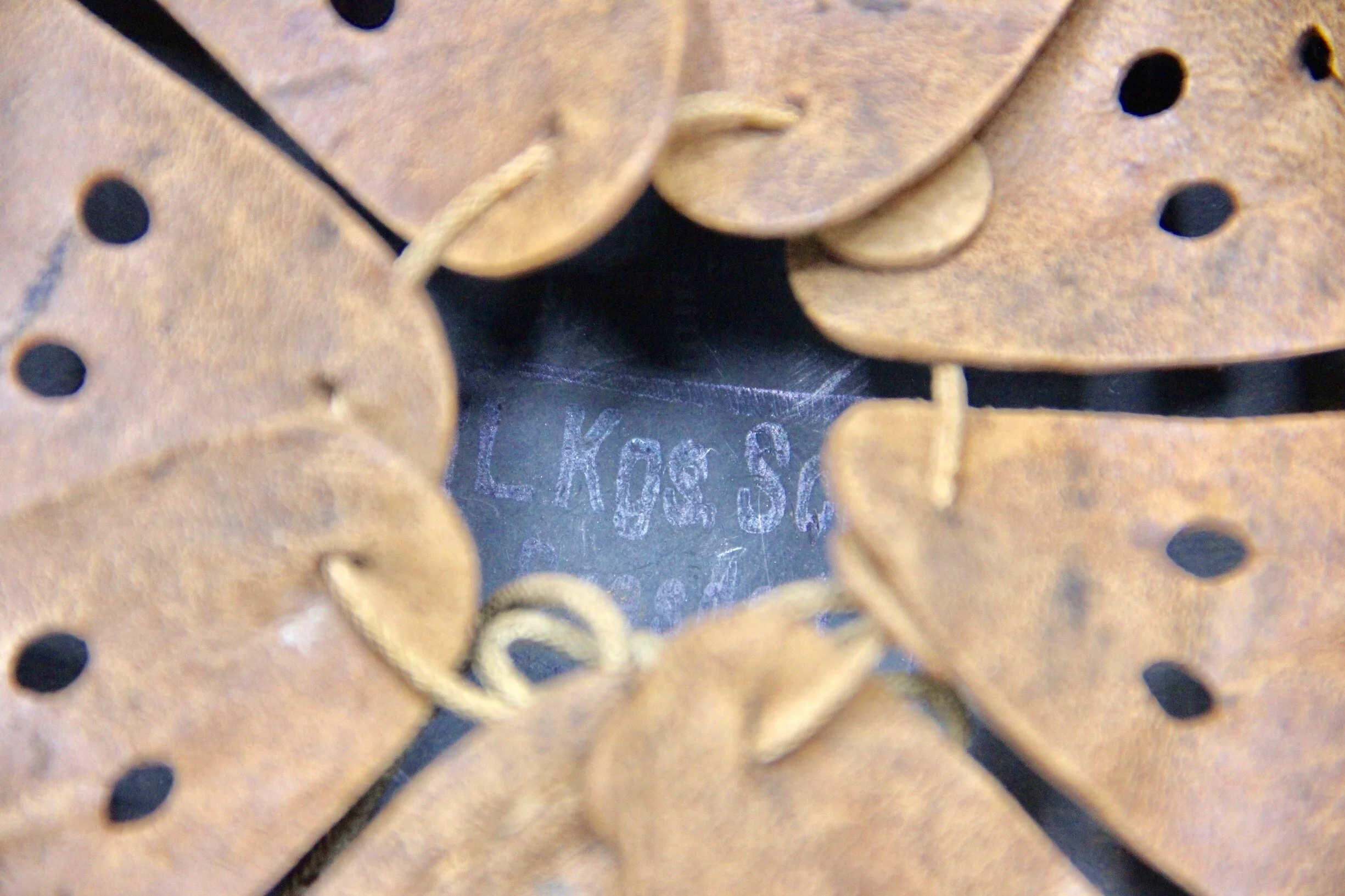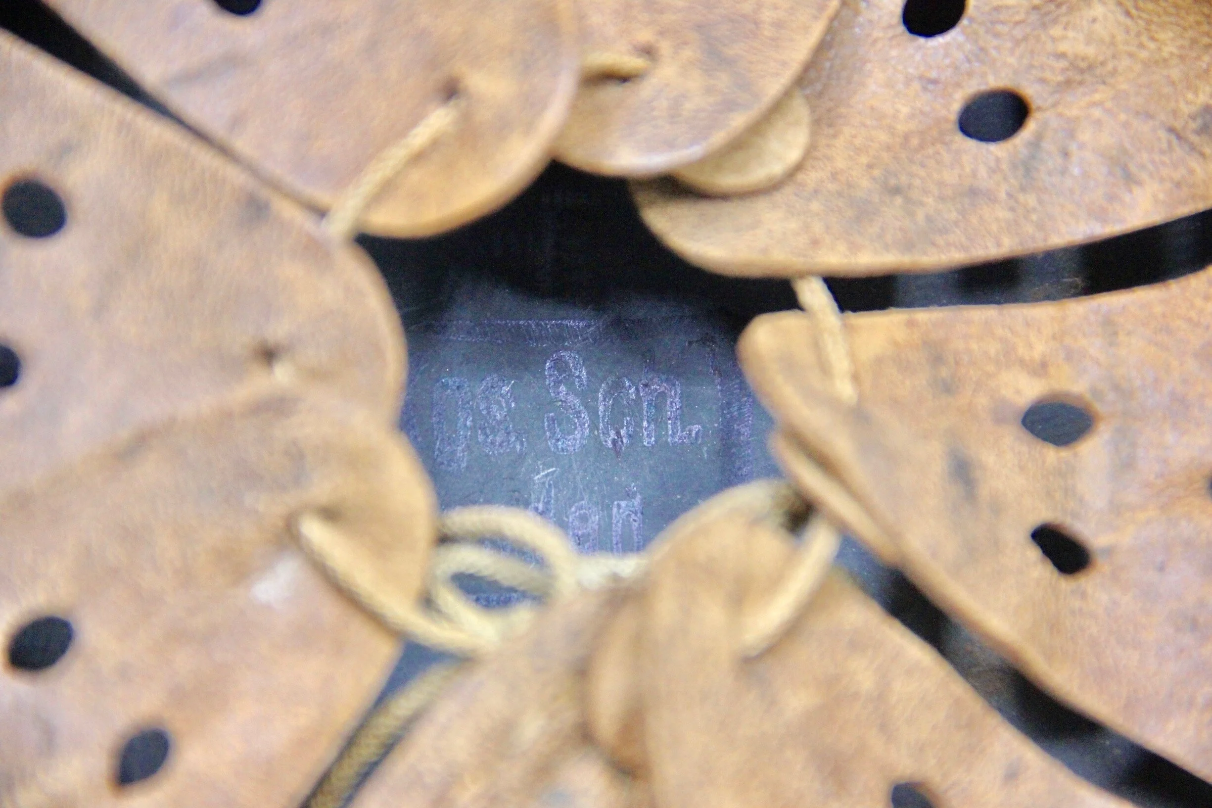 Looking towards the inside of the helmet, we can see that the liner is in perfect shape. It really doesnt get better than this. Complete with all fingers, and its original draw string – the leather is still very soft and flexible. Also marked on the inside of the helmet is a very legible dome stamp. This reads :